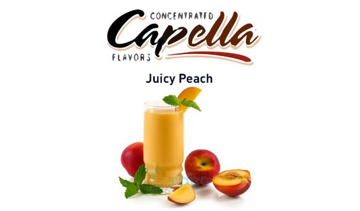 Сочный, сладкий, спелый персик — Juicy Peach от фабрики премиальных вкусовых концентратов Capella Flavor (США). Данная арома создана на основе натуральных эссенций и спирта, имеет выраженную сладость во вкусе. Рекомендуется смешиваяать ароматизатор Juicy Peach в пропорции 10% в сингл-рецептах и около 5% с другими ароматизаторами.